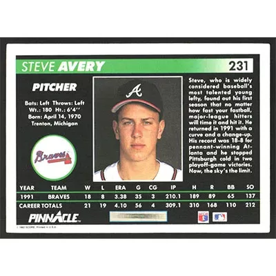 This is a 1992 Pinnacle Steve Avery baseball card. The card is #231 and pictures show condition.