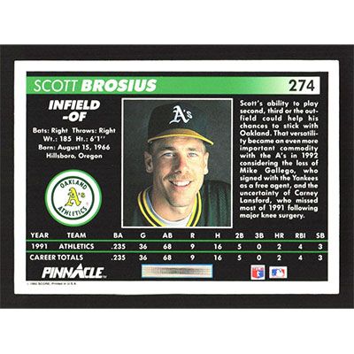 This is a 1992 Pinnacle Scott Brosius baseball card. The card is #274 and pictures show condition.