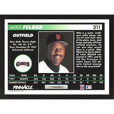 This is a 1992 Pinnacle Mike Felder baseball card. The card is #311 and pictures show condition.