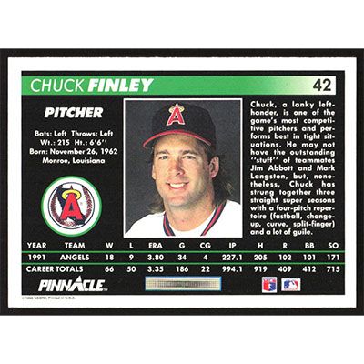 This is a 1992 Pinnacle Chuck Finley baseball card. The card is #42 and pictures show condition.
