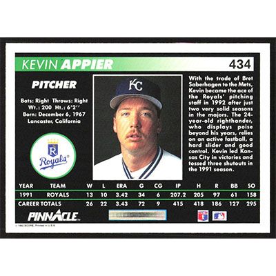 This is a 1992 Pinnacle Kevin Appier baseball card. The card is #434 and pictures show condition.