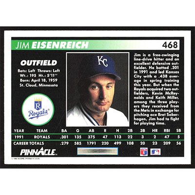 This is a 1992 Pinnacle Jim Eisenreich baseball card. The card is #468 and pictures show condition.