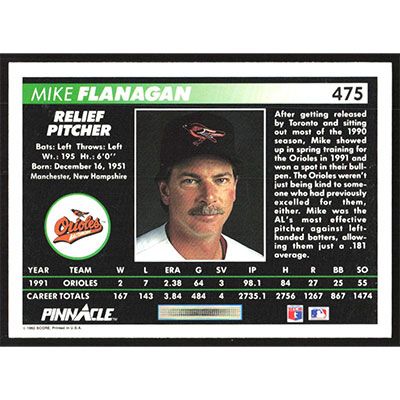 This is a 1992 Pinnacle Mike Flanagan baseball card. The card is #475 and pictures show condition.