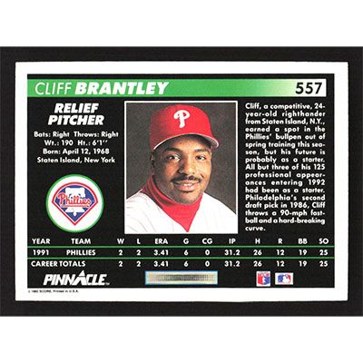 This is a 1992 Pinnacle Cliff Brantley baseball card. The card is #557 and pictures show condition.