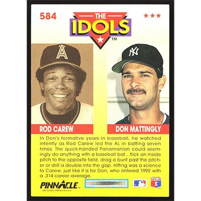 This is a 1992 Pinnacle Don Mattingly and Rod Carew The Idols baseball card. The card is #584 and pictures show condition. Team(s): New York Yankees/California Angels