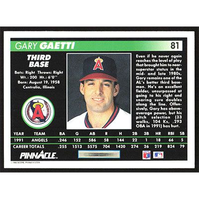 This is a 1992 Pinnacle Gary Gaetti baseball card. The card is #81 and pictures show condition.