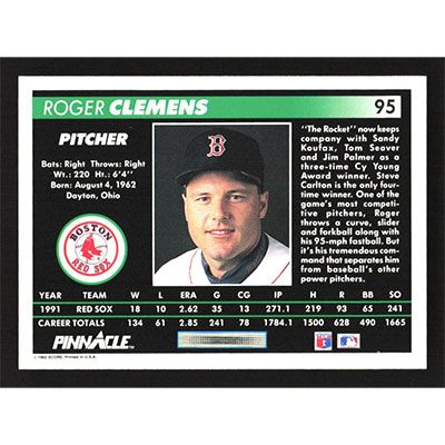 This is a 1992 Pinnacle Roger Clemens baseball card. The card is #95 and pictures show condition.