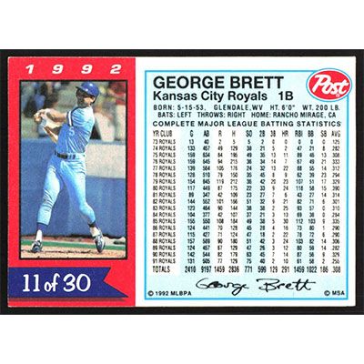 This is a 1992 Post George Brett baseball card. The card is #11 and pictures show condition.