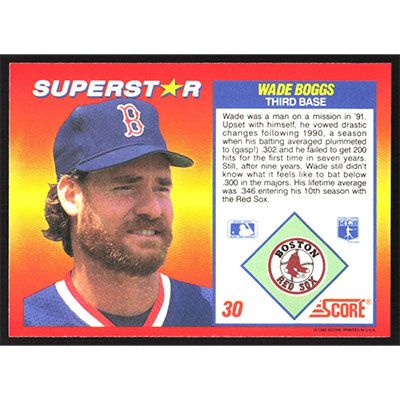 This is a 1992 Score 100 Superstars Wade Boggs baseball card. The card is #30 and pictures show condition.