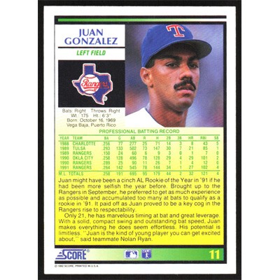 This is a 1992 Score Juan Gonzalez baseball card. The card is #11 and pictures show condition.