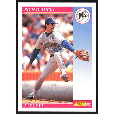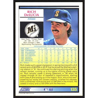 This is a 1992 Score Rich DeLucia baseball card. The card is #135 and pictures show condition.