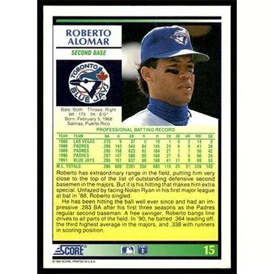 This is a 1992 Score Roberto Alomar baseball card. The card is #15 and pictures show condition.