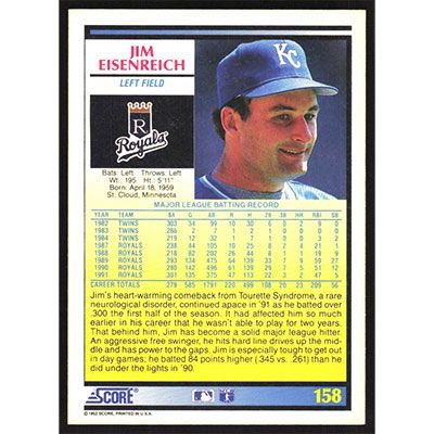 This is a 1992 Score Jim Eisenreich baseball card. The card is #158 and pictures show condition.