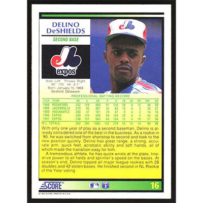 This is a 1992 Score Delino DeShields baseball card. The card is #16 and pictures show condition.