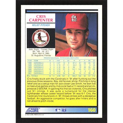 This is a 1992 Score Cris Carpenter baseball card. The card is #160 and pictures show condition.