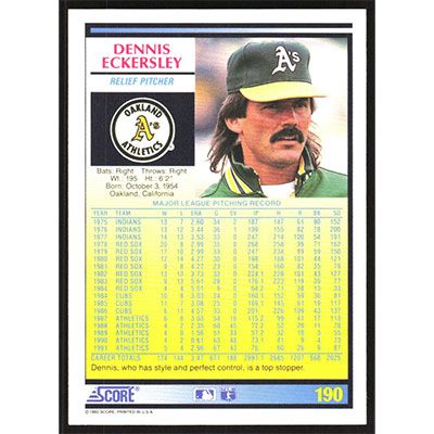This is a 1992 Score Dennis Eckersley baseball card. The card is #190 and pictures show condition.