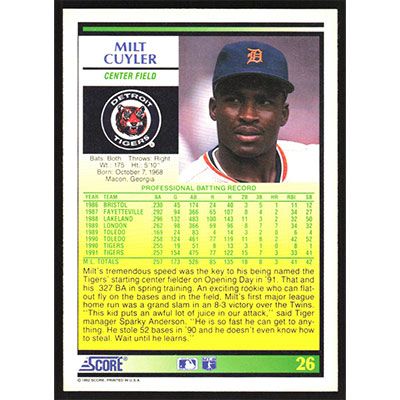 This is a 1992 Score Milt Cuyler baseball card. The card is #26 and pictures show condition.