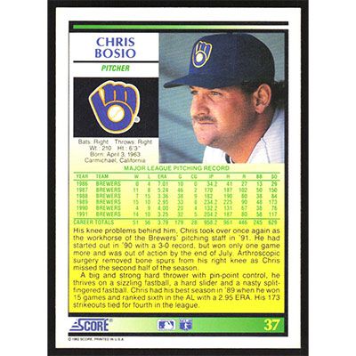 This is a 1992 Score Chris Bosio baseball card. The card is #37 and pictures show condition.