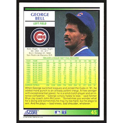 This is a 1992 Score George Bell baseball card. The card is #45 and pictures show condition.