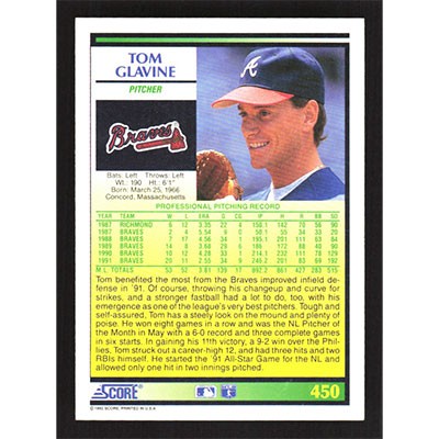 This is a 1992 Score Tom Glavine baseball card. The card is #450 and pictures show condition.