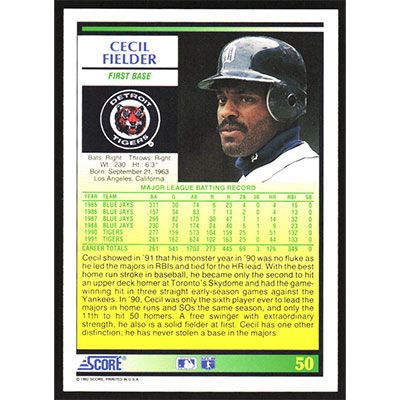 This is a 1992 Score Cecil Fielder baseball card. The card is #50 and pictures show condition.