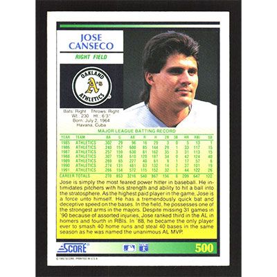 This is a 1992 Score Jose Canseco baseball card. The card is #500 and pictures show condition.