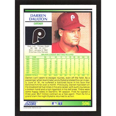 This is a 1992 Score Darren Daulton baseball card. The card is #506 and pictures show condition.