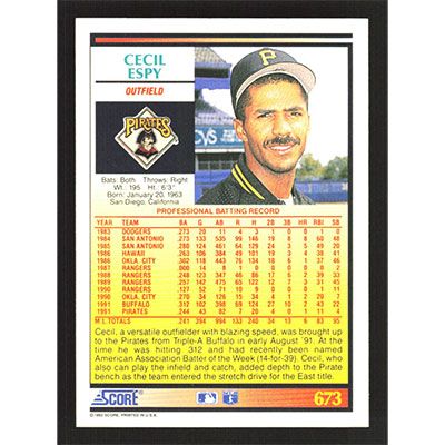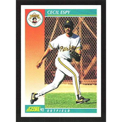 This is a 1992 Score Cecil Espy baseball card. The card is #673 and pictures show condition.