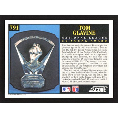 This is a 1992 Score Tom Glavine Cy Young Award baseball card. The card is #791 and pictures show condition.