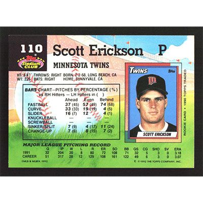 This is a 1992 Stadium Club Scott Erickson baseball card. The card is #110 and pictures show condition.