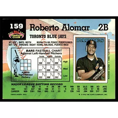 This is a 1992 Stadium Club Roberto Alomar baseball card. The card is #159 and pictures show condition.