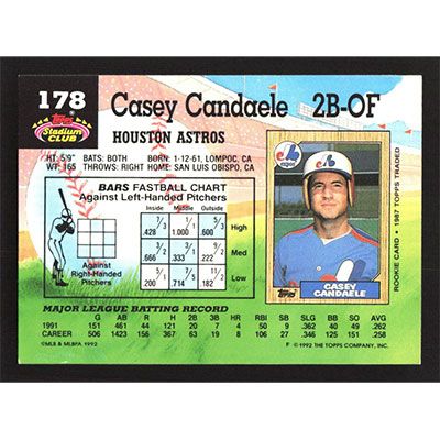 This is a 1992 Stadium Club Casey Candaele baseball card. The card is #178 and pictures show condition.