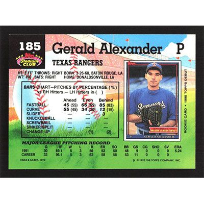 This is a 1992 Stadium Club Gerald Alexander baseball card. The card is #185 and pictures show condition.
