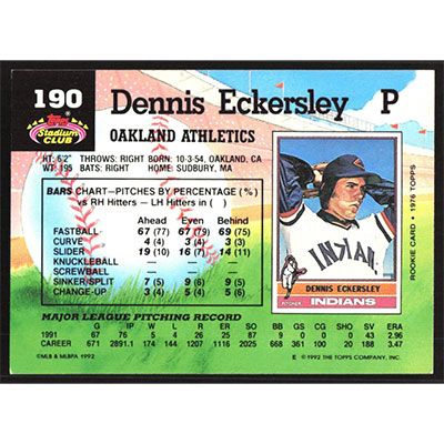 This is a 1992 Stadium Club Dennis Eckersley baseball card. The card is #190 and pictures show condition.