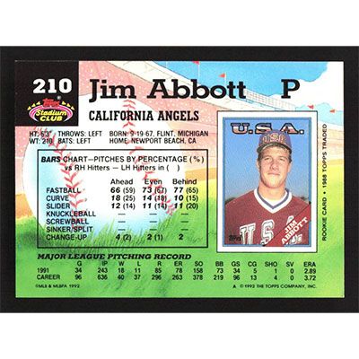 This is a 1992 Stadium Club Jim Abbott baseball card. The card is #210 and pictures show condition.
