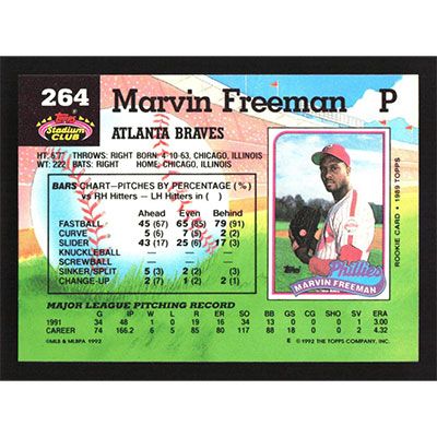 This is a 1992 Stadium Club Marvin Freeman baseball card. The card is #264 and pictures show condition.