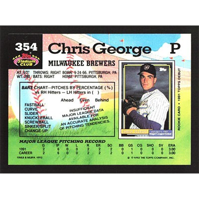 This is a 1992 Stadium Club Chris George baseball card. The card is #354 and pictures show condition.