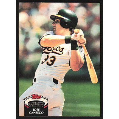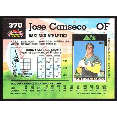 This is a 1992 Stadium Club Jose Canseco baseball card. The card is #370 and pictures show condition.