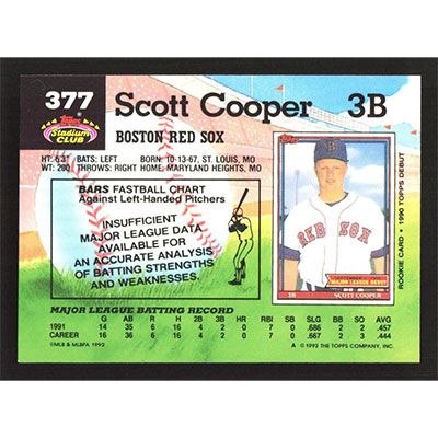 This is a 1992 Stadium Club Scott Cooper baseball card. The card is #377 and pictures show condition.