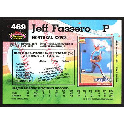 This is a 1992 Stadium Club Jeff Fassero baseball card. The card is #469 and pictures show condition.