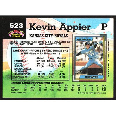 This is a 1992 Stadium Club Kevin Appier baseball card. The card is #523 and pictures show condition.