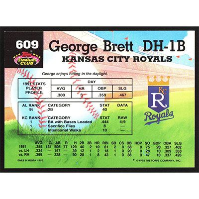This is a 1992 Stadium Club George Brett Members Choice baseball card. The card is #609 and pictures show condition.