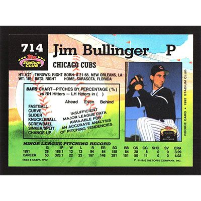 This is a 1992 Stadium Club Jim Bullinger baseball card. The card is #714 and pictures show condition.