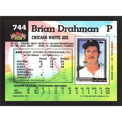 This is a 1992 Stadium Club Brian Drahman baseball card. The card is #744 and pictures show condition.