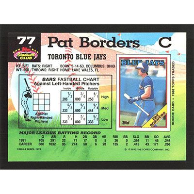 This is a 1992 Stadium Club Pat Borders baseball card. The card is #77 and pictures show condition.