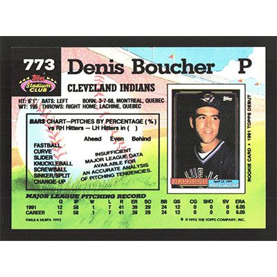 This is a 1992 Stadium Club Denis Boucher baseball card. The card is #773 and pictures show condition.