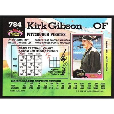 This is a 1992 Stadium Club Kirk Gibson baseball card. The card is #784 and pictures show condition.