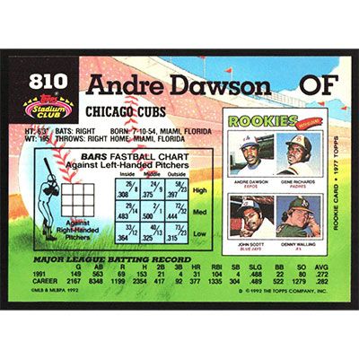 This is a 1992 Stadium Club Andre Dawson baseball card. The card is #810 and pictures show condition.