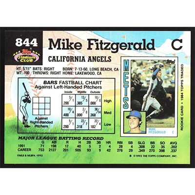 This is a 1992 Stadium Club Mike Fitzgerald baseball card. The card is #844 and pictures show condition.