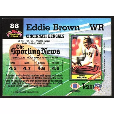 This is a 1992 Stadium Club Eddie Brown football card. The card is #88 and pictures show condition.